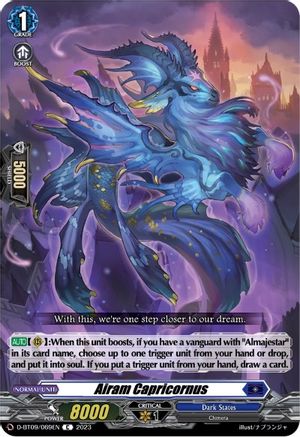 [AUTO](RC):When this unit boosts, if you have a vanguard with "Almajestar" in its card name, choose up to one trigger unit from your hand or drop, and put it into soul. If you put a trigger unit from your hand, draw a card.