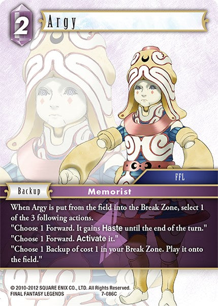 When Argy is put from the field into the Break Zone, select 1 of the 3 following actions."Choose 1 Forward. It gains Haste until the end of the turn.""Choose 1 Forward. Activate it.""Choose 1 Backup of cost 1 in your Break Zone. Play it onto the field."