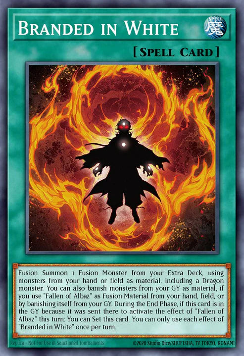 Fusion Summon 1 Fusion Monster from your Extra Deck, using monsters from your hand or field as material, including a Dragon monster. You can also banish monsters from your GY as material, if you use "Fallen of Albaz" as Fusion Material from your hand, field, or by banishing itself from your GY. During the End Phase, if this card is in the GY because it was sent there to activate the effect of "Fallen of Albaz" this turn: You can Set this card. You can only use each effect of "Branded in White" once per turn.