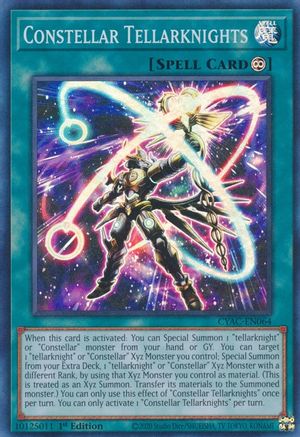 When this card is activated: You can Special Summon 1 "tellarknight" or "Constellar" monster from your hand or GY. You can target 1 "tellarknight" or "Constellar" Xyz Monster you control; Special Summon from your Extra Deck, 1 "tellarknight" or "Constellar" Xyz Monster with a different Rank, by using that Xyz Monster you control as material. (This is treated as an Xyz Summon. Transfer its materials to the Summoned monster.) You can only use this effect of "Constellar Tellarknights" once per turn. You can only activate 1 "Constellar Tellarknights" per turn.