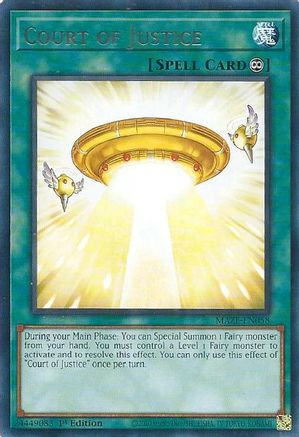 Once per turn: You can Special Summon 1 Fairy-Type monster from your hand. You must control a face-up Level 1 Fairy-Type monster to activate and to resolve this effect. You can only activate the effect of one "Court of Justice" per turn.
