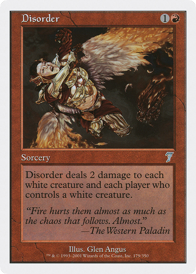Disorder deals 2 damage to each white creature and each player who controls a white creature.