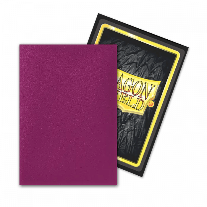 Japanese size Dragon Shield Dual Matte sleeves. Clear front and a textured matte back. Fully opaque sleeves with a black interior, an elegant backdrop for black bordered cards.
