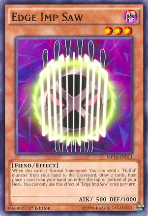 When this card is Normal Summoned: You can send 1 "Fluffal" monster from your hand to the Graveyard; draw 2 cards, then place 1 card from your hand on either the top or bottom of your Deck. You can only use this effect of "Edge Imp Saw" once per turn.