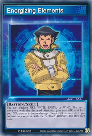 You can declare FIRE, WATER, EARTH, or WIND. This turn, monsters with the declared Attribute gain 500 ATK and lose 400 DEF, also any battle damage they inflict is halved. If you control no monsters with the declared Attribute, flip this card over.