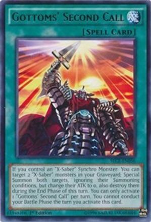If you control an "X-Saber" Synchro Monster: You can target 2 "X-Saber" monsters in your Graveyard; Special Summon both targets, ignoring their Summoning conditions, but change their ATK to 0, also destroy them during the End Phase of this turn. You can only activate 1 "Gottoms' Second Call" per turn. You cannot conduct your Battle Phase the turn you activate this card.