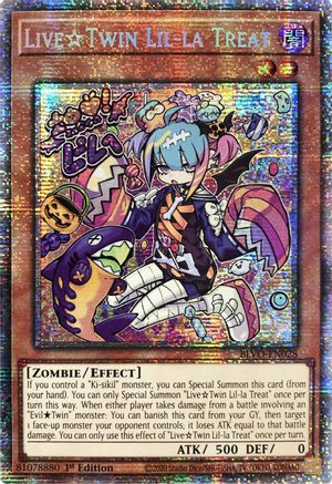 If you control a "Ki-sikil" monster, you can Special Summon this card (from your hand). You can only Special Summon "Live Twin Lil-la Treat" once per turn this way. When either player takes damage from a battle involving an "Evil Twin" monster: You can banish this card from your GY, then target 1 face-up monster your opponent controls; it loses ATK equal to that battle damage. You can only use this effect of "Live Twin Lil-la Treat" once per turn.