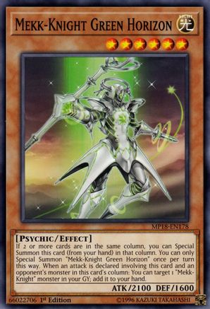 If 2 or more cards are in the same column, you can Special Summon this card (from your hand) in that column. You can only Special Summon "Mekk-Knight Green Horizon" once per turn this way. When an attack is declared involved this card and an opponent's monster in this card's column: You can target 1 "Mekk-Knight" monster in your GY; add it to your hand.