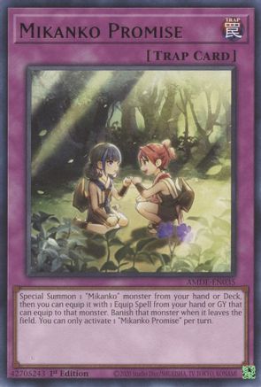 Special Summon 1 "Mikanko" monster from your hand or Deck, then you can equip it with 1 Equip Spell from your hand or GY that can equip to that monster. Banish that monster when it leaves the field. You can only activate 1 "Mikanko Promise" per turn.