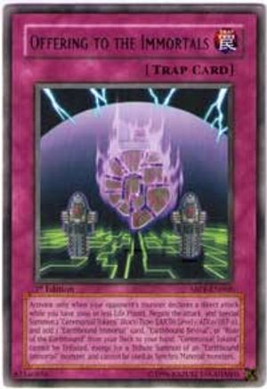 Activate only when your opponent's monster declares a direct attack while you have 3000 or less Life Points. Negate the attack, and Special Summon 2 "Ceremonial Tokens" (Rock-Type/EARTH/Level 1/ATK 0/DEF 0), and add 1 "Earthbound Immortal" card, "Earthbound Revival", or "Roar of the Earthbound" from your Deck to your hand. "Ceremonial Tokens" cannot be Tributed, except for a Tribute Summon of an "Earthbound Immortal" monster, and cannot be used as Synchro Material monsters.