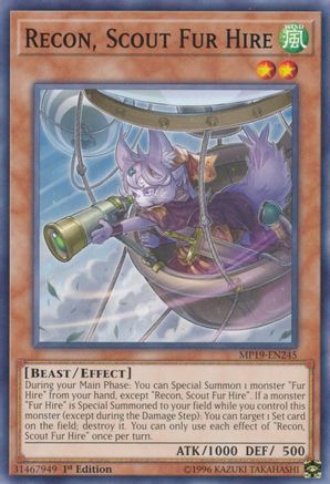 During your Main Phase: You can Special Summon 1 monster "Fur Hire" from your hand, except "Recon, Scout Fur Hire". If a monster "Fur Hire" is Special Summoned to your field while you control this monster (except during the Damage Step): You can target 1 Set card on the field; destroy it. You can only use each effect of "Recon, Scout Fur Hire" once per turn.