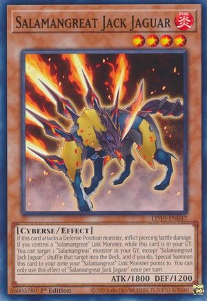 If this card attacks a Defense Position monster, inflict piercing battle damage. If you control a "Salamangreat" Link Monster, while this card is in your GY: You can target 1 "Salamangreat" monster in your GY, except "Salamangreat Jack Jaguar"; shuffle that target into the Deck, and if you do, Special Summon this card to your zone your "Salamangreat" Link Monster points to. You can only use this effect of "Salamangreat Jack Jaguar" once per turn.