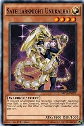 If this card is Summoned: You can send 1 "tellarknight" card from your Deck to the Graveyard, except "Satellarknight Unukalhai". You can only use this effect of "Satellarknight Unukalhai" once per turn.