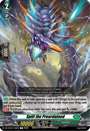 [AUTO]:When this unit is rode upon by a unit with "Zorga" in its card name and [Divine Skill], choose up to one normal order from your drop, and put it into hand.