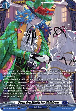 [AUTO]:When this card is put into the order zone, look at the top five cards of your deck, choose up to two [Happy Toys] from among them, reveal them, choose up to one card from among the revealed cards, put it into hand, put the rest of the revealed cards into soul, and shuffle the deck.