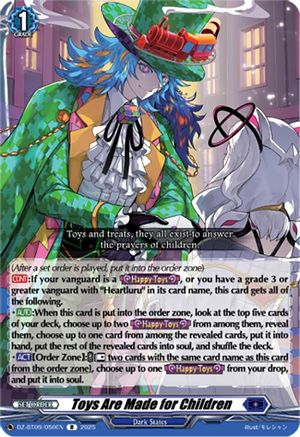 [AUTO]:When this card is put into the order zone, look at the top five cards of your deck, choose up to two [Happy Toys] from among them, reveal them, choose up to one card from among the revealed cards, put it into hand, put the rest of the revealed cards into soul, and shuffle the deck.