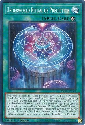 This card is used to Ritual Summon any "Prediction Princess" Ritual Monster from your hand or GY in face-up Attack Position or face-down Defense Position. You must also Tribute monsters from your hand or field, whose total Levels equal or exceed the Level of the Ritual Monster you Ritual Summon. During the Standby Phase, if you control a "Prediction Princess" Ritual Monster: You can banish this card from your GY; Special Summon 1 non-Ritual "Prediction Princess" monster from your Deck in face-down Defense Position.