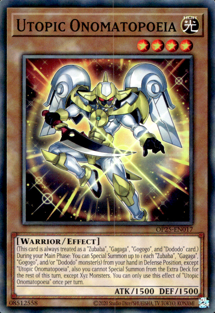 During your Main Phase: You can Special Summon up to 1 each "Zubaba", "Gagaga", "Gogogo", and/or "Dododo" monster(s) from your hand in Defense Position, except "Utopic Onomatopoeia", also you cannot Special Summon from the Extra Deck for the rest of this turn, except Xyz Monsters. You can only use this effect of "Utopic Onomatopoeia" once per turn.