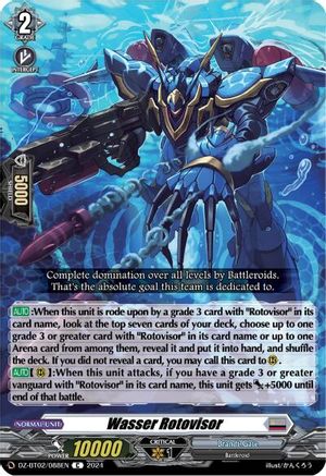 [AUTO]:When this unit is rode upon by a grade 3 card with "Rotovisor" in its card name, look at the top seven cards of your deck, choose up to one grade 3 or greater card with "Rotovisor" in its card name or up to one Arena card from among them, reveal it and put it into hand, and shuffle the deck. If you did not reveal a card, you may call this card to (RC).